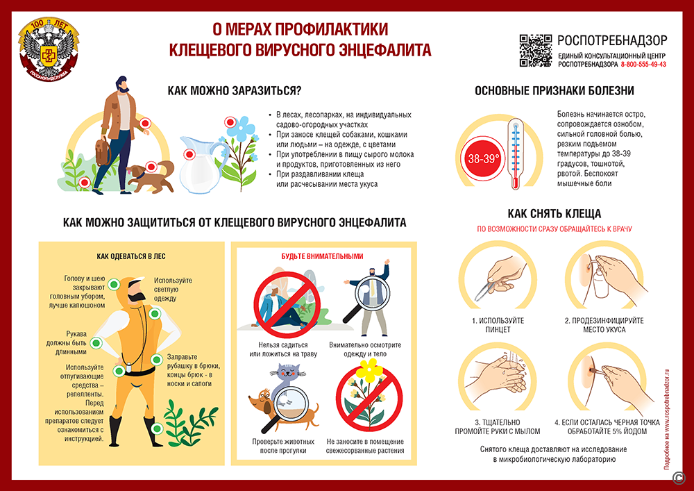 Помните, что своевременное обнаружение клеща, а затем раннее обращение за медицинской помощью и своевременное лечение способствуют предупреждению и благоприятному исходу заболевания. Главная мера защиты от заражения клещевым энцефалитом (неспецифическая профилактика)- не допускать присасывания клеща.